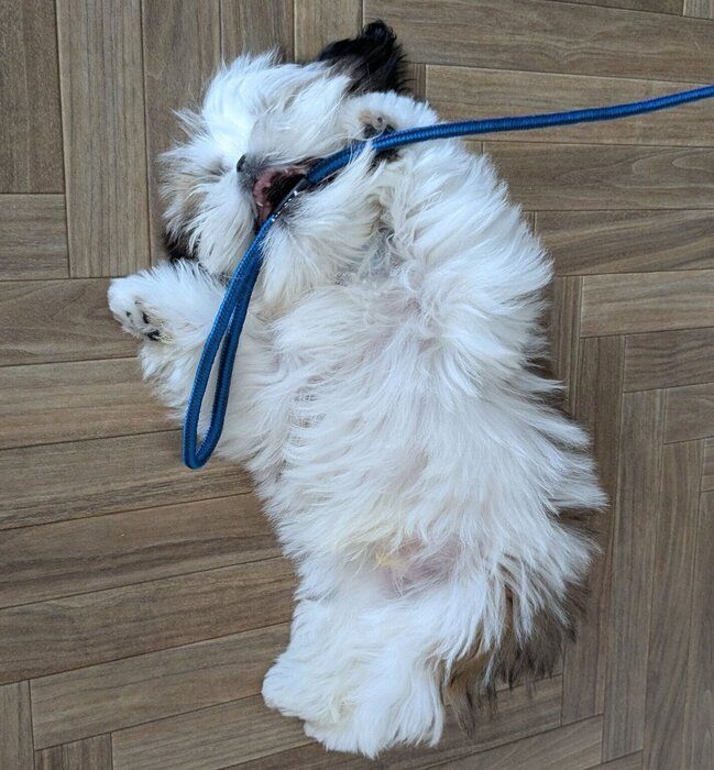 ヘソ天しながらリードをカミカミする愛らしいシー・ズーのズシくん。1才8カ月に成長した今も“俺様キャラ全開”で飼い主さんを放置しつつ、唯一無二の相棒として寄り添う姿を紹介します。