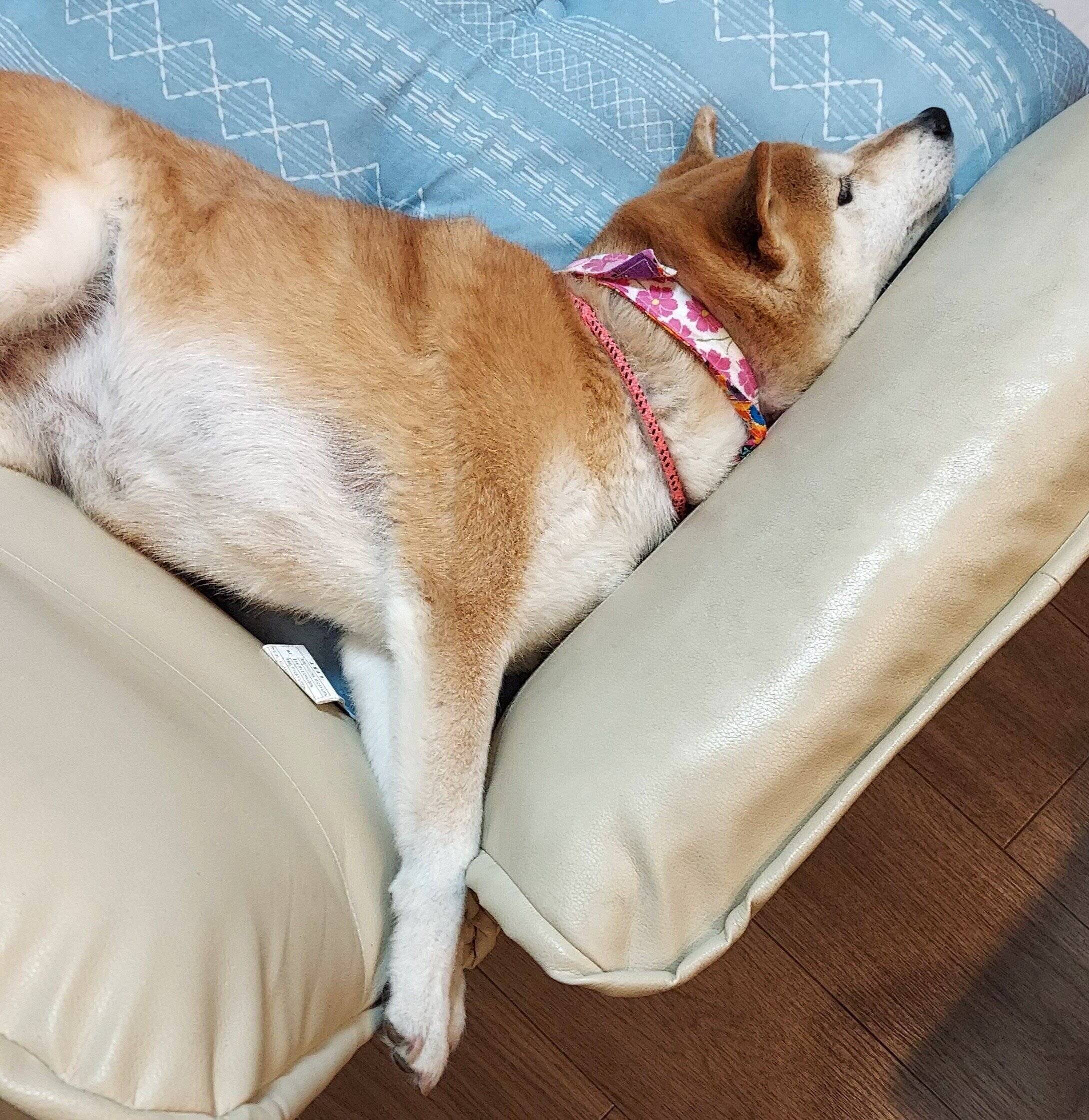 紹介するのは、X(旧Twitter)ユーザー@nWqY4Y627Os5A7Hさんの愛犬・けんじくん(取材時1才)。こちらは、先住犬ゆうちゃんのベッドに横たわるけんじくんをとらえた写真です。