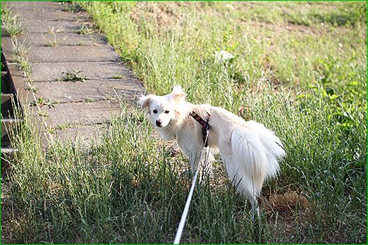散歩デビューの日、ハーネスが大きくて“むちむち”に見えたポメラニアンの子犬・たわしちゃん。初めての散歩で見せた意外な一面や、2才目前の現在の“たぬき顔”な成長ぶりを紹介します。