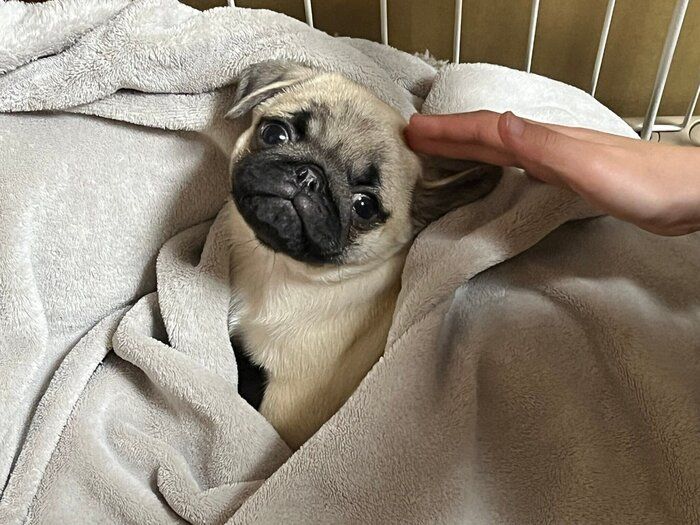 紹介するのは、X(旧Twitter)ユーザー@pugnomarro39022さんの愛犬・マロンくん(取材時1才/パグ)。1枚目は、生後約2カ月半のマロンくんを撮影した写真です。お迎えしたては緊張した顔をしていたというマロンくんは約5カ月後、どんなコに成長したのでしょうか?