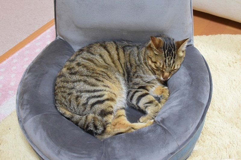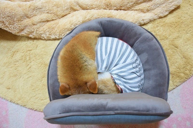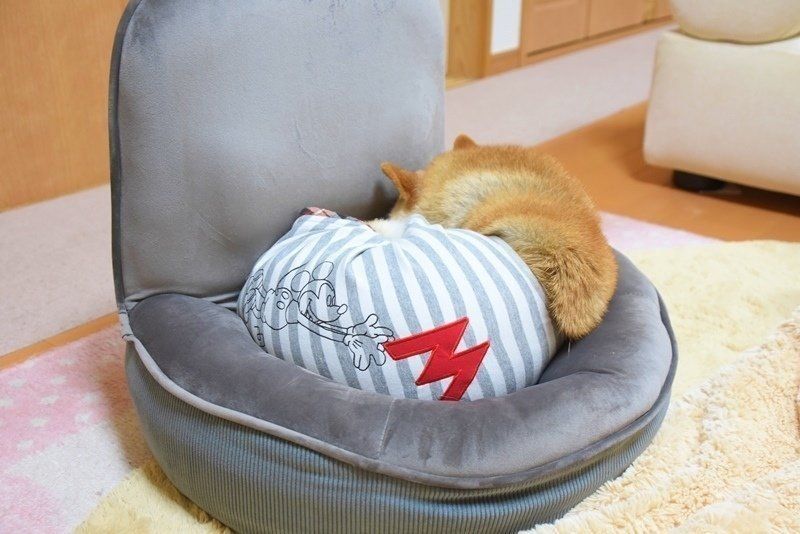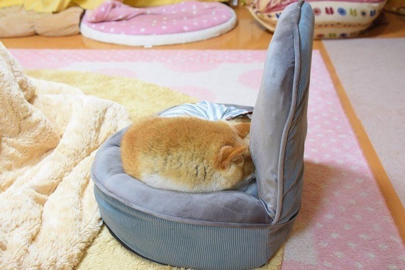 寝姿はまるで猫。柴犬かぼちゃんもお気に入りの座椅子です。
