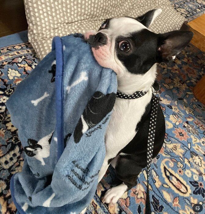 散歩の準備をしていると、ボストン・テリアのりーちくんがブランケットを持参! 得意げにくわえてスタンバイする姿が可愛らしいんです。普段から散歩のたびに大はしゃぎで、おもちゃやブランケットをくわえて走り回るそう。りーちくんのクスッとする姿を紹介します。