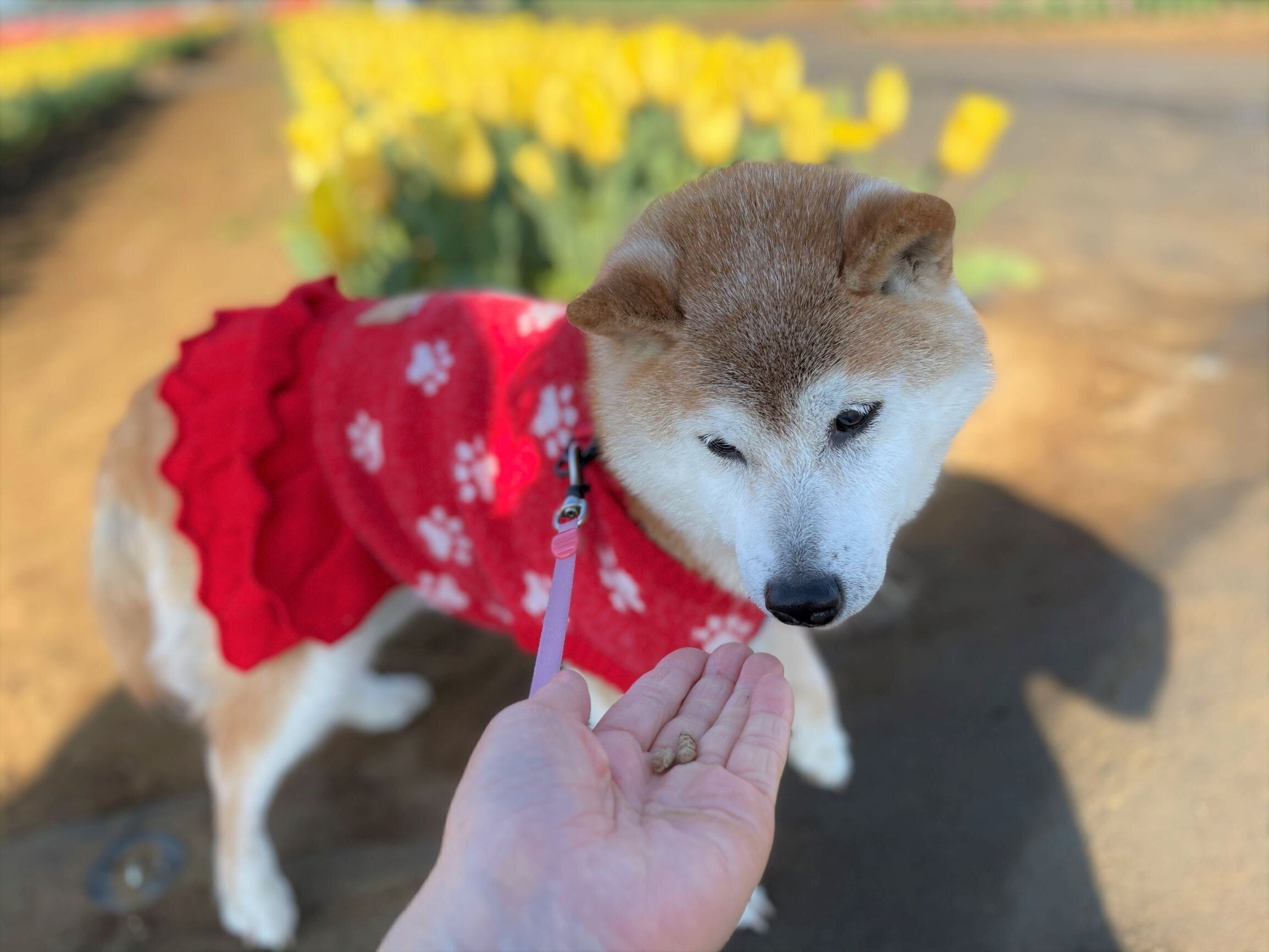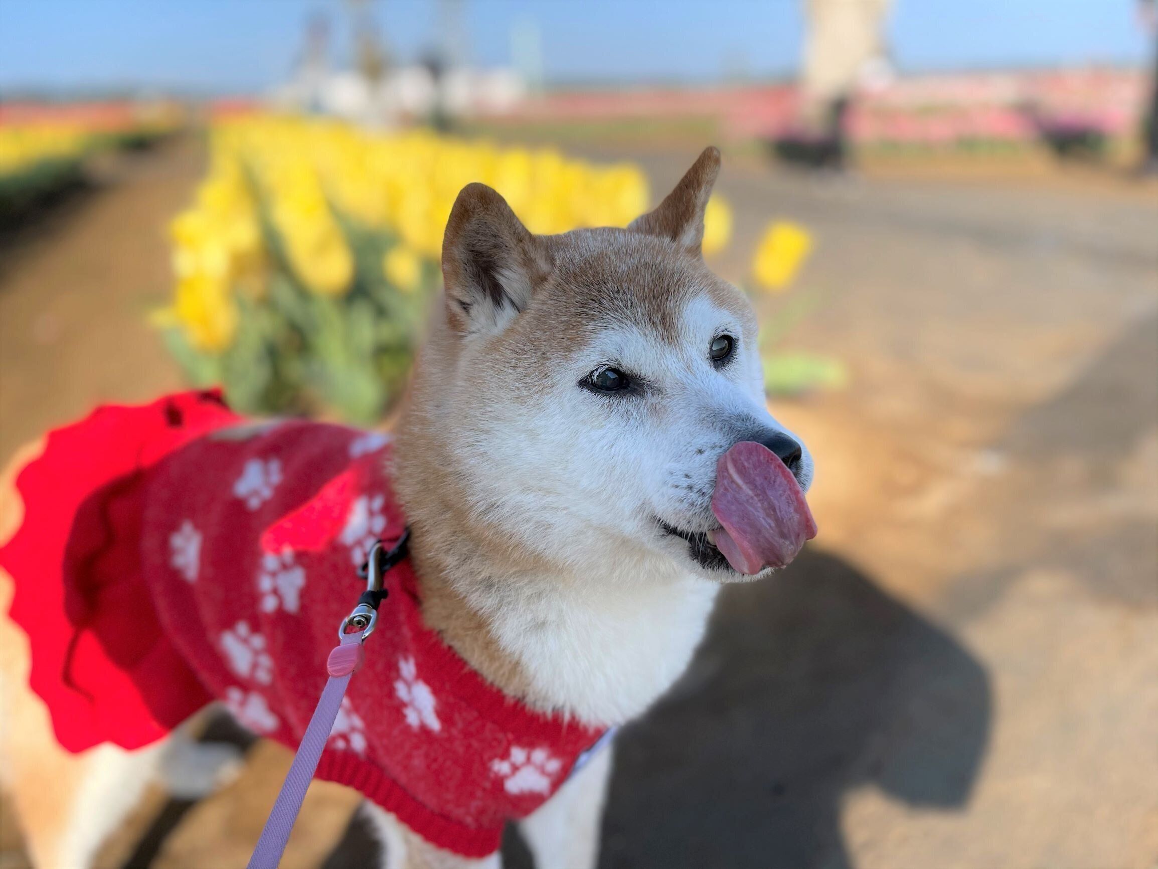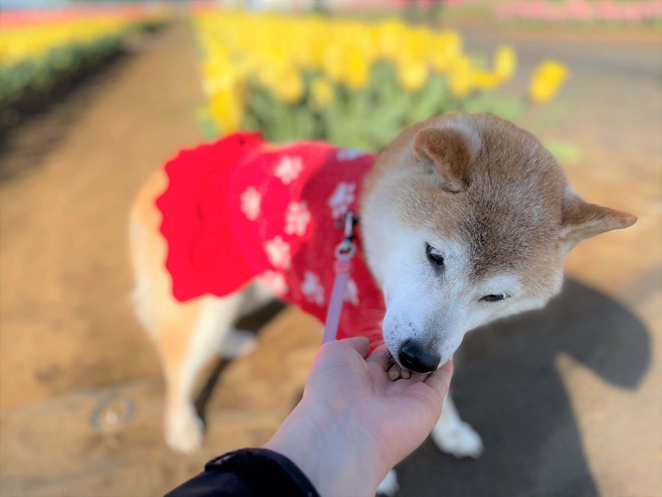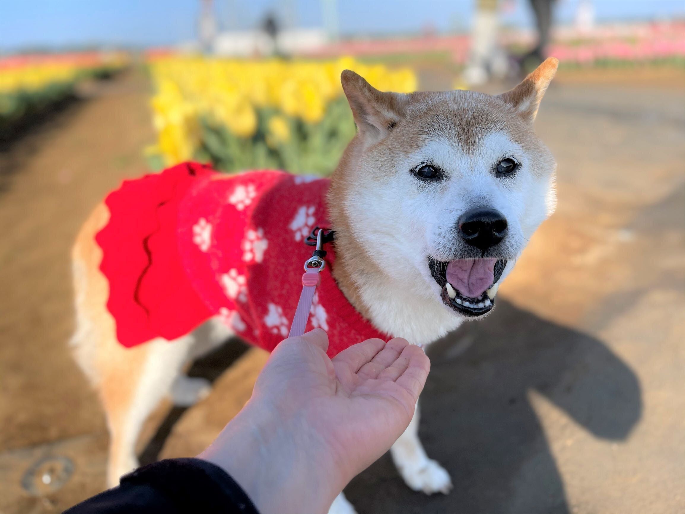 満開のお花を背景に撮影!モデルの柴犬かぼすちゃんはギャラ(ドッグフード2粒)に贅沢は言いません!