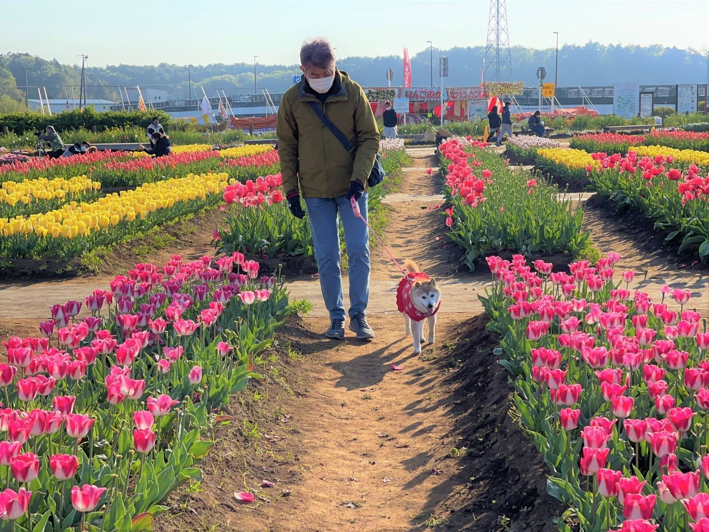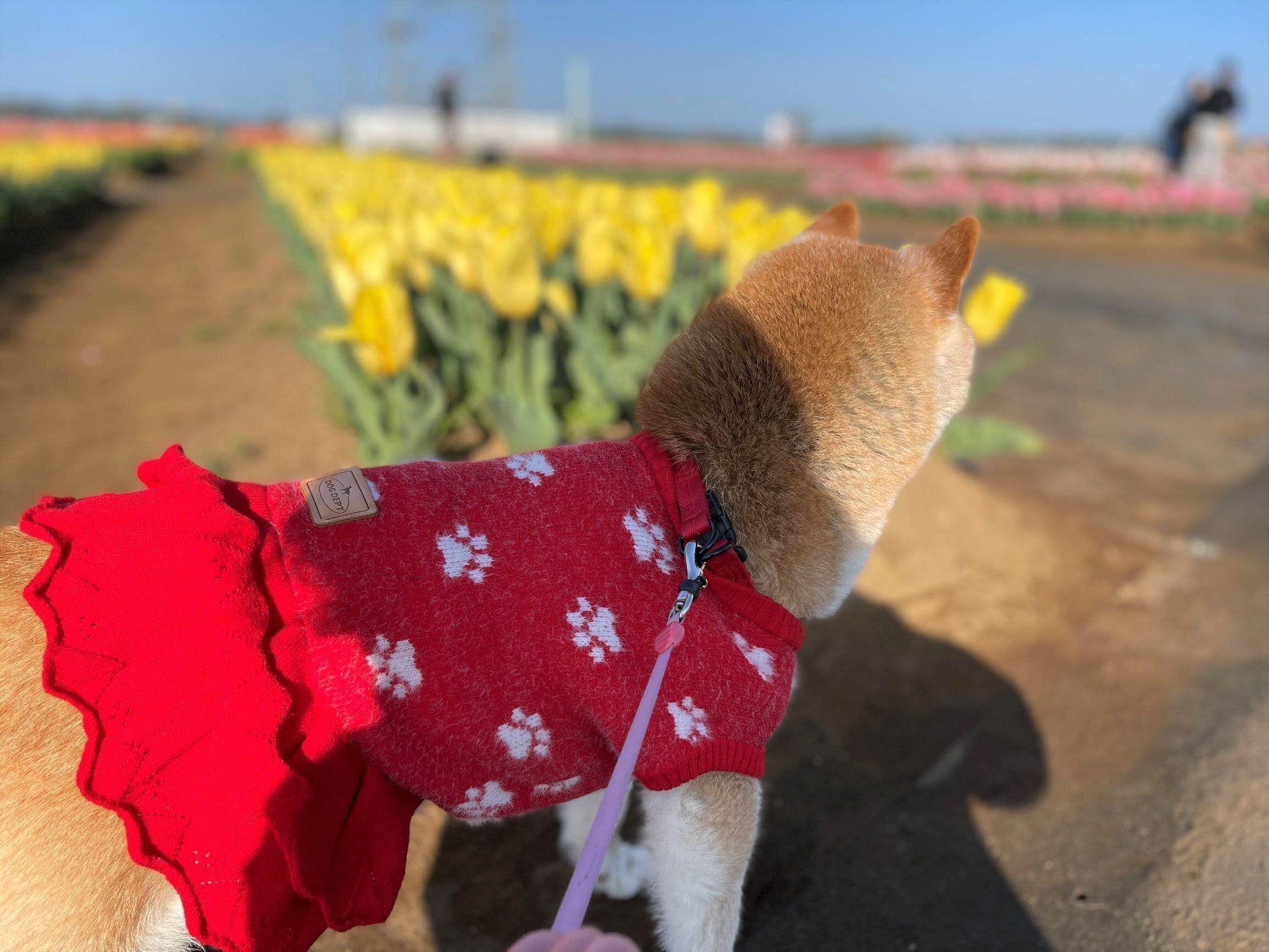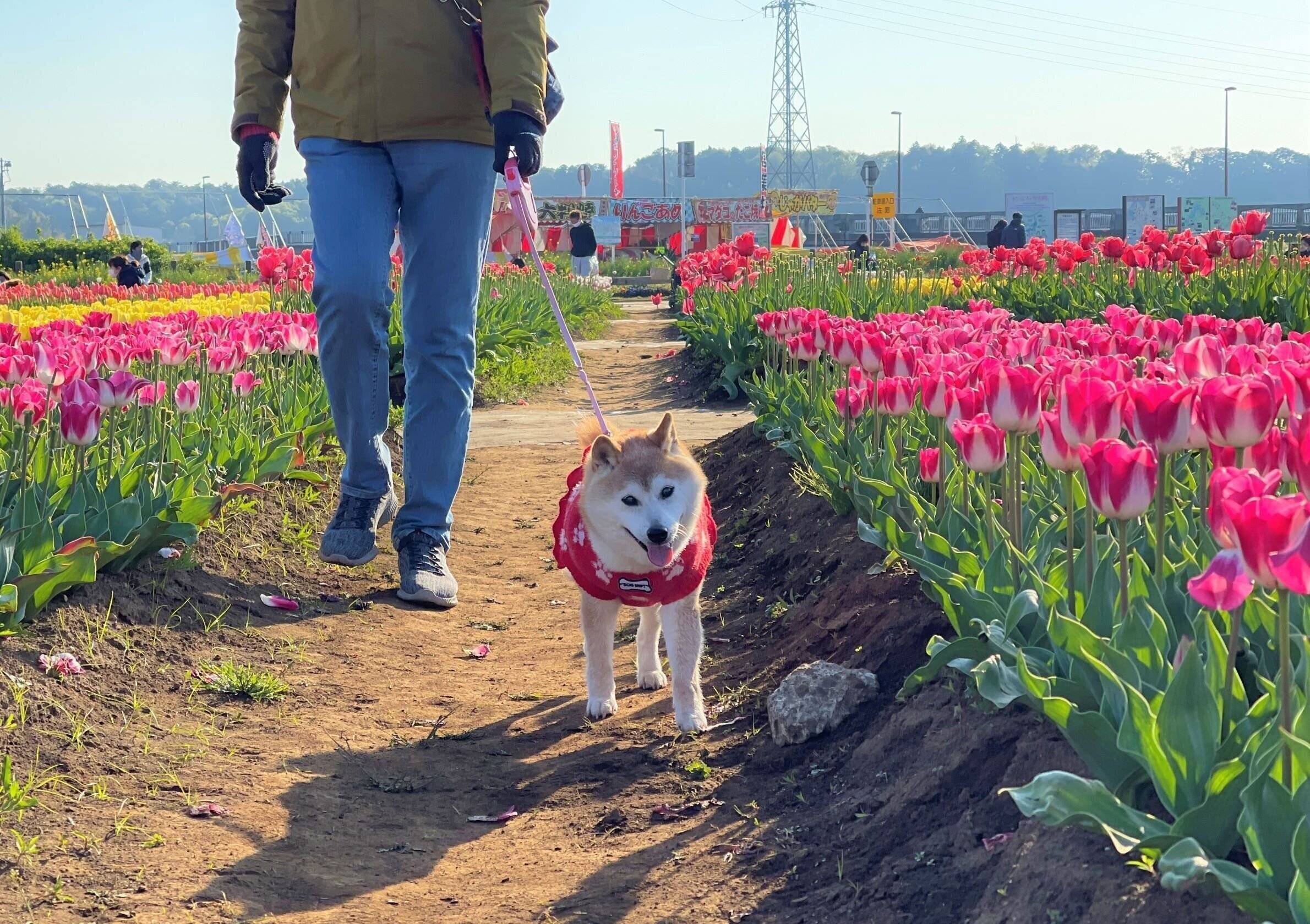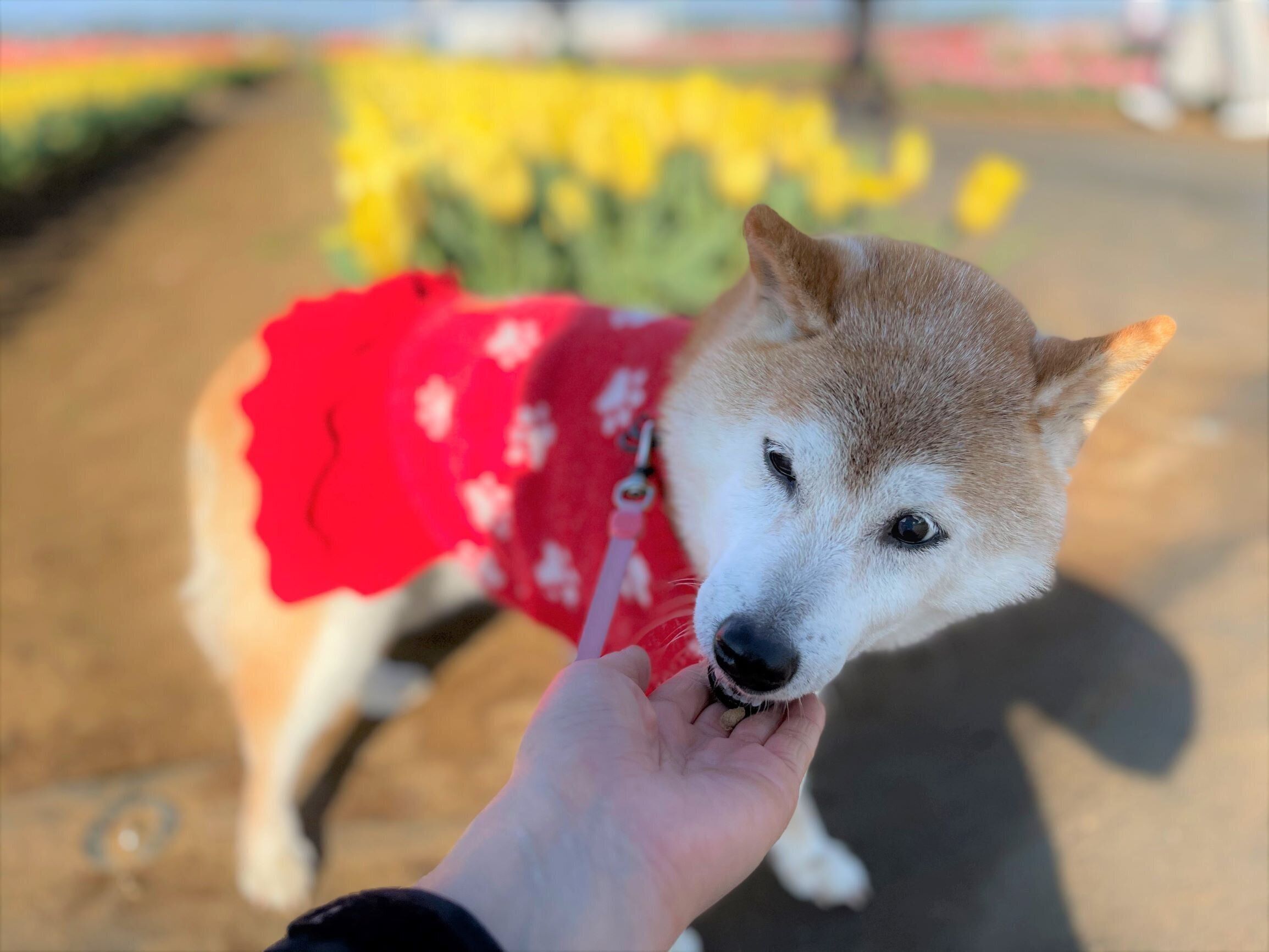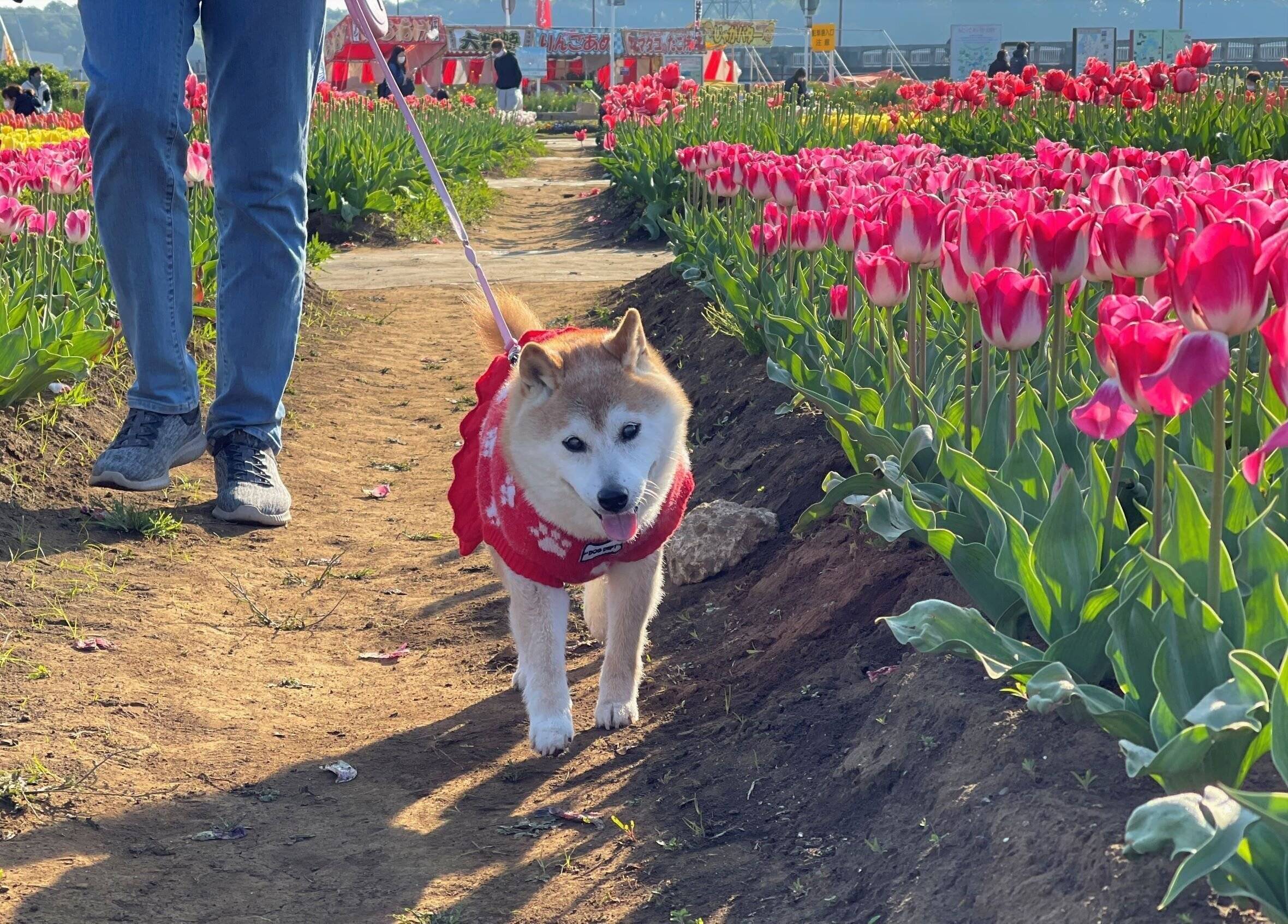 満開のお花を背景に撮影!モデルの柴犬かぼすちゃんはギャラ(ドッグフード2粒)に贅沢は言いません!
