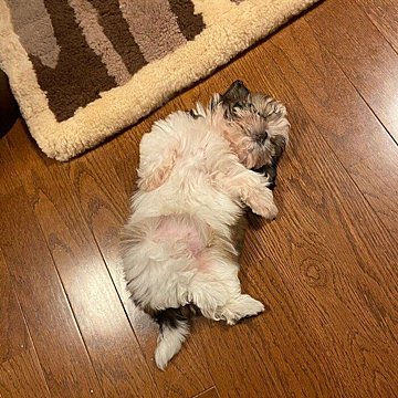 お迎え初日からあおむけになって寝転がるシー・ズー子犬→5年経った今も変わらぬ寝姿にほっこり