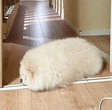 部屋の入口で寝転がるポメラニアンの姿が話題に!「アザラシ」「わたあめみたい」と大反響