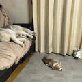 さっきまで騒がしかったのにみんなで“電池切れ”! リビングでパタリと眠る新入りコーギー&先住ハスキーに反響