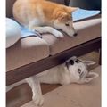 ソファの下でくつろぐハスキー、真上に先住柴がいることに気づくと目が泳ぎ「ヤベッ……」と驚くような反応に!?