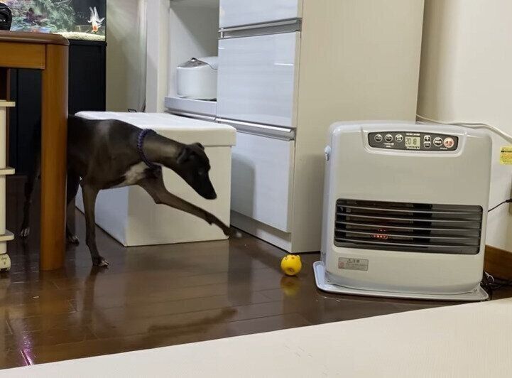 ヒーターの近くに転がってしまったボールをおっかなびっくり取ろうとしているのは、イタリアン・グレーハウンドのベリーくん。腰が引けながらも長い前足を伸ばしてようやく取れそうになったところで、同居犬のリンゴちゃんが登場して……?