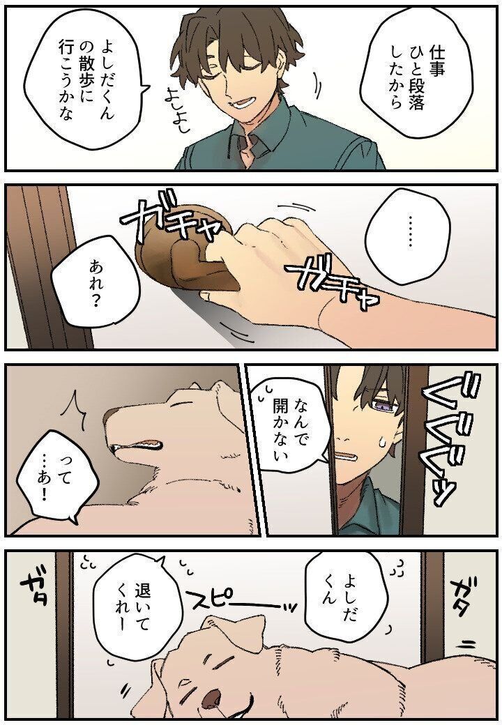 【連載】暮瀬姉弟と吉田くん 仕事がひと段落した周一は、吉田くんの散歩に行こうと部屋を出ようとする。しかし扉が開かない。どうしてだろうと頑張って扉を押してみると、狭い視界に映ったのはなんとドアの前で寝転がっている吉田くんの姿。周一がいる部屋の前で待っている間に眠ってしまったらしい。大型犬で微動だにしない扉の向こうで周一は必死に吉田くんに呼びかけるのだった。