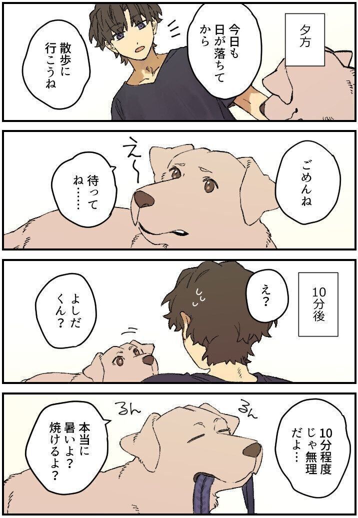 【連載】暮瀬姉弟と吉田くん 夕方、周一に近づいてくる吉田くん。春までなら散歩の時間には違いないけれども、もう夜に近くないと外には出られない暑さに「後でね」「待ってね」と声をかける周一。不満げな顔を見せつつ、一度は納得してくれた吉田くんだったが、その10分後……散歩用のリードを持ってきた吉田くんにびっくりする周一だった。まだ外は暑いよ。
