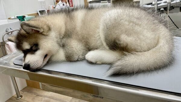 Twitterユーザー@ara_aru6さんの愛犬・アルくん(アラスカン・マラミュート/撮影当時、生後2カ月)。気持ちよさそうにスヤスヤと眠っているアルくんですが…アルくんが寝ている場所は、なんと動物病院の診察台! 病院が苦手な犬が多いなか、診察台で堂々と寝ていたんです。当時の様子などについて、飼い主さんに話を聞きました。