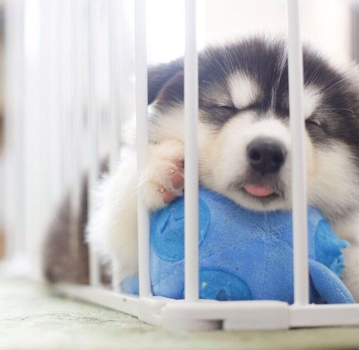 紹介するのは、X(旧Twitter)ユーザー@fu_bu_ki115さんが投稿していた、愛犬・フブキくん(取材時、生後7カ月/アラスカン・マラミュート)の2枚の比較写真。1枚目には、生後66日に撮影したフブキくんの姿が写っています。ケージの中でスヤスヤと眠るフブキくんは、小さくてモフモフで、コロッとしたフォルムがたまらなく可愛いです。子犬ならではな姿を見せているフブキくんですが、2枚目の写真にはフブキくんの驚きの姿が!