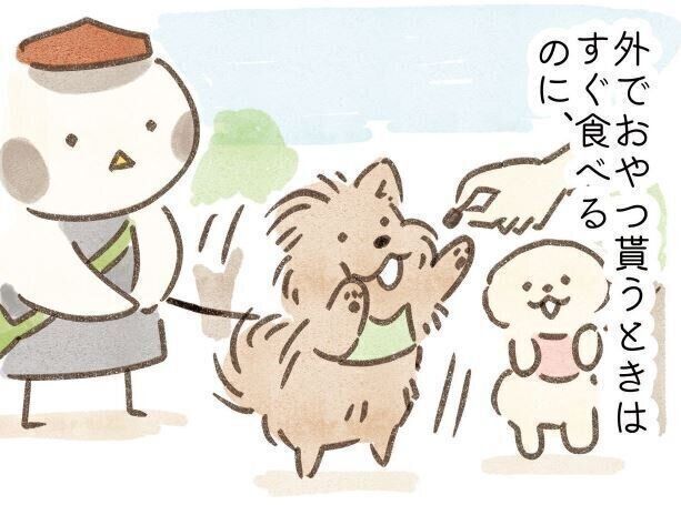 【連載】こぐま犬てんすけ おやつ大好きなのになぜか家だと慎重に食べる犬。飼い主としては喜んで食べてるのか心配になるというお話です。