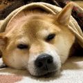 こたつに入ってお顔だけ出してる柴犬の福くん。まったり、ぬくぬくタイムです。ウトウト……だんだん目が閉じてきちゃいました。