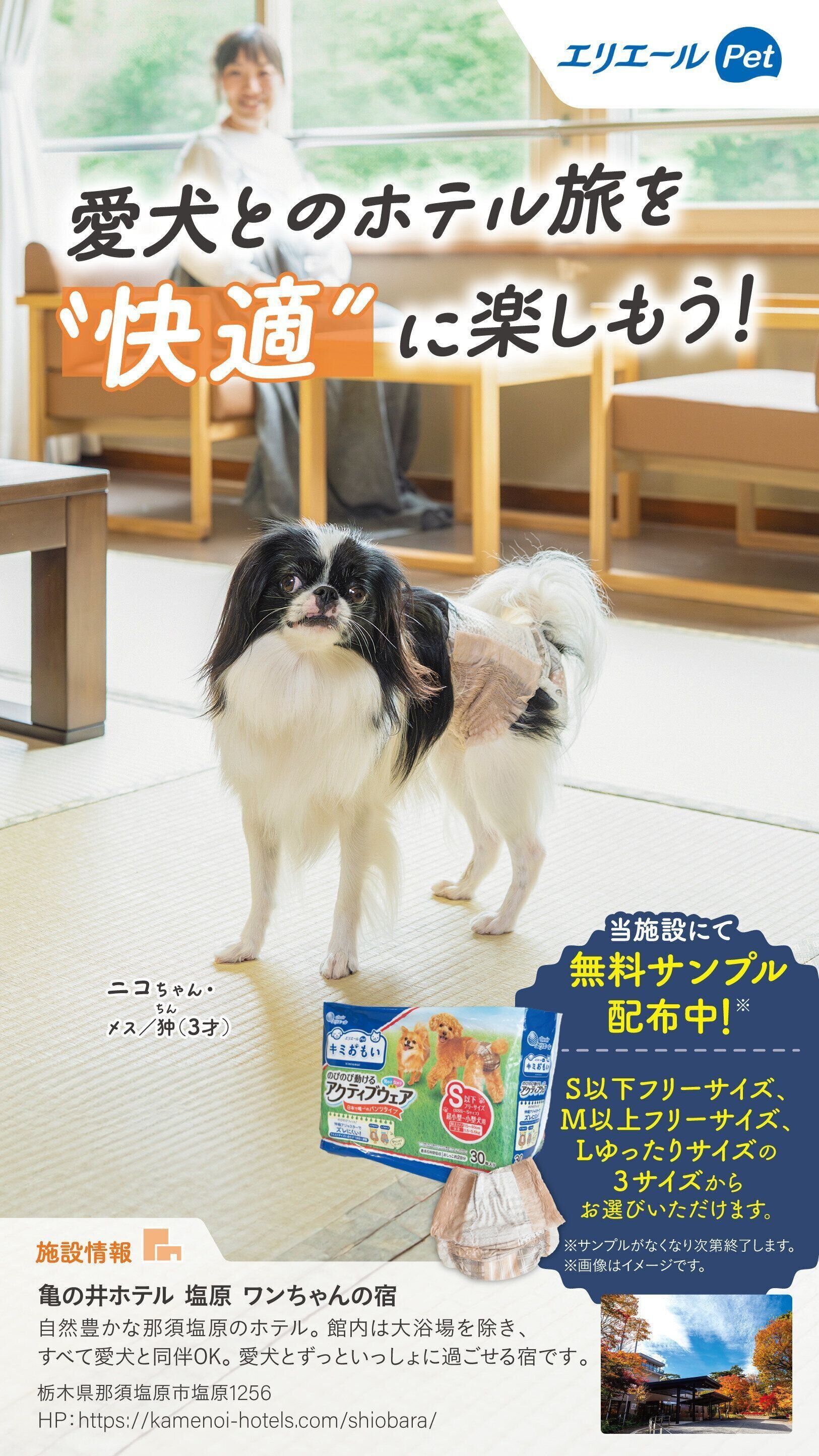 お出かけ連載第2回目は、那須塩原にある自然豊かなホテル<strong>「亀の井ホテル 塩原 ワンちゃんの宿」</strong>にやってきました! 飼い主さんと和室でのんびり過ごしているのは狆(ちん)の女の子、ニコちゃん(3才)。 ニコちゃんがはいている<strong>エリエールPet キミおもい「のびのび動けるアクティブウェア」</strong>は濡れにくくフィット感も抜群。万が一、オシッコやマーキングをしてもしっかりキャッチするから、お部屋以外の場所でも自由に探索を楽しめます。
