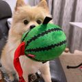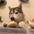 音が鳴る鏡餅のおもちゃに首をかしげるハスキー、夢中になるうちに