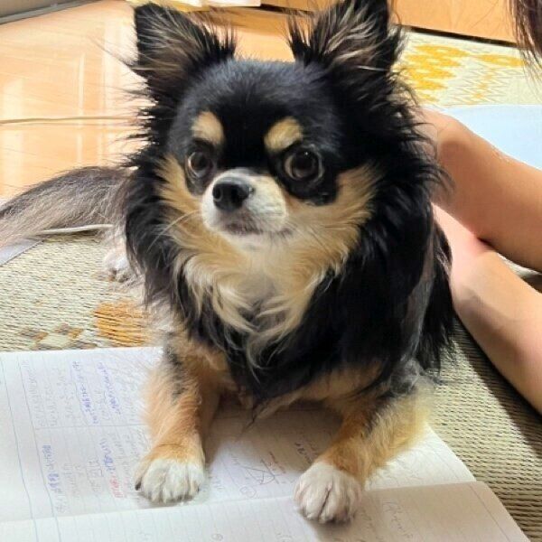X(旧Twitter)ユーザー@chocochan_0214さんの愛犬・チョコちゃん。くつろいでいるのは、お子さんのノートの上だった!? 勉強している息子さんのノートに乗ったチョコちゃんは、「勉強するより私を見て! ナデナデして!」と言わんばかりにアピールしていたそうです。この光景からはどのようなことがわかるのか、獣医師に聞きました。