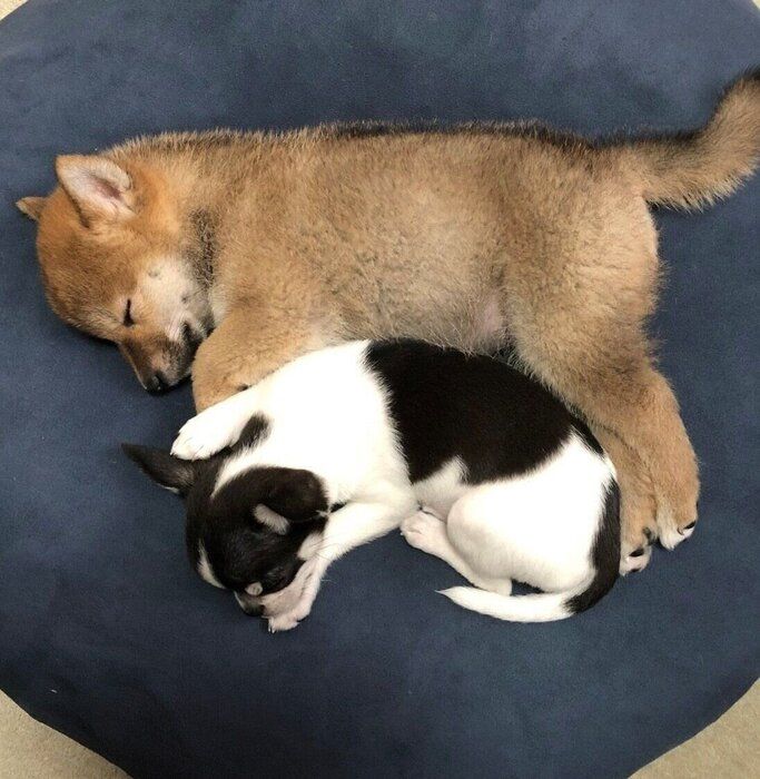 紹介するのは、X(旧Twitter)ユーザー@harahetta___zさんが投稿していた、愛犬・あずきちゃん(柴犬)といくらちゃん(チワワ)の2枚のビフォーアフター写真。1枚目には、生後3カ月の頃に撮影した2頭の姿が写っています。飼い主さんによると、2頭は同時期にお迎えしたコだそうで、生後2カ月頃から一緒に暮らしているとのこと。1つのベッドで仲良く眠る姿が、なんとも可愛らしいです。そんな2頭は現在3才(取材時)になりました。どのようなコに成長したのでしょうか。