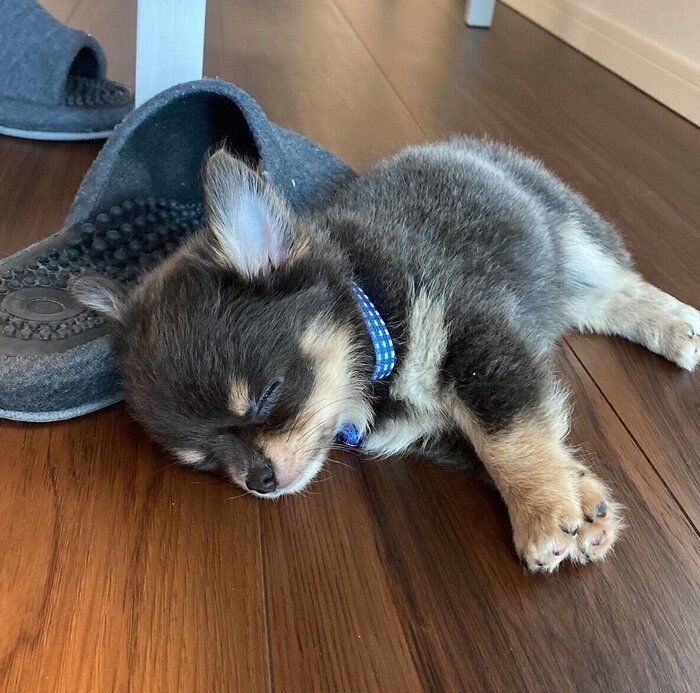 紹介するのは、Instagramユーザー@yukky.channelさんが投稿していたこちらの写真。そこには、床の上で気持ちよさそうに眠っている愛犬・ゆきちゃん(撮影時、生後2カ月/チワワ)の姿が写っています。すぐ隣にあるスリッパと同じサイズ感のゆきちゃん。なんとも可愛らしい光景ですが、飼い主さんに話を聞くと、撮影エピソードもとても微笑ましいものでした。
