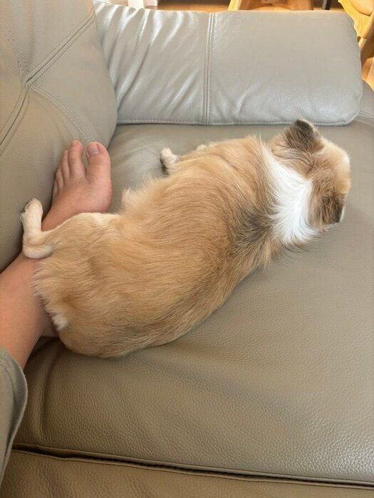 「なんかあったかいな」ソファで寝ていた飼い主さんの足元に愛犬が!ぴとっと寄り添う姿に癒される