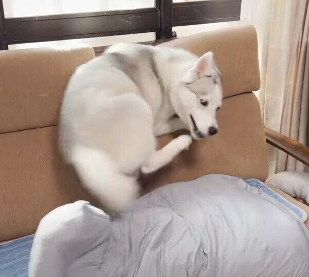紹介するのは、X(旧Twitter)ユーザー@miyamafukayamaさんが「自分のサイズを分かってないハスキー」と投稿していた動画。寝ている先輩犬・リクくん(トイ・プードル)のもとにやってきた後輩犬・アシㇼちゃん(シベリアン・ハスキー)が映っています。リクくんと一緒に寝たかったアシㇼちゃんですが、体が大きいアシㇼちゃんが寝られるスペースはありません。「どうしようか」と少し考え込んだ様子のアシㇼちゃんは、このあとクスッとするような行動に出たようです。