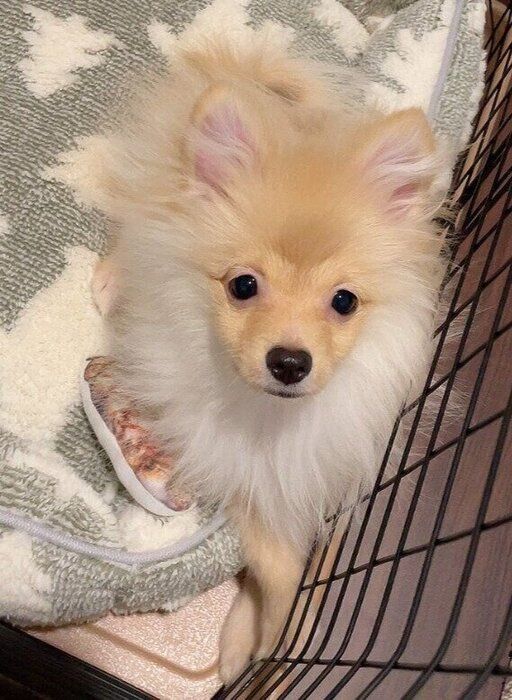 紹介するのは、X(旧Twitter)ユーザー@lotte_orangeさんの愛犬・ロッテちゃん(取材時、1才/ポメラニアン)の成長ビフォーアフター。こちらは生後3カ月頃のロッテちゃんの写真です。飼い主さんのもとにお迎えしたばかりのときにケージのなかで過ごしている様子を撮影しました。