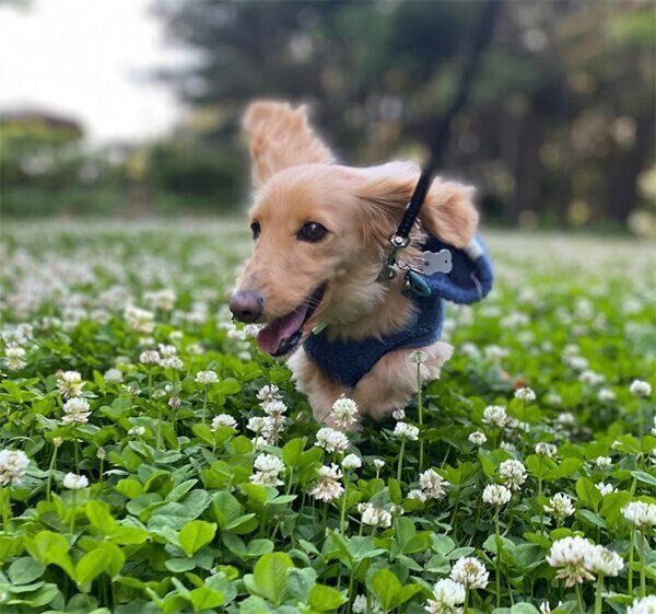 Instagramユーザー@maruoka51さんの愛犬・大吉くん(取材当時5才/ミニチュア・ダックスフンド)。目の前に広がるシロツメクサを見つけて一目散に走っていく姿は、元気いっぱい! 大吉くんは元保護犬で、虐待されていた過去がありました。そのせいで右後足が曲がらずに、足を引きずるようになってしまったのだといいます。その大吉くんが、こんなにも元気いっぱいに走っているのです。大吉くんについて、飼い主さんに詳しいお話を聞きました。