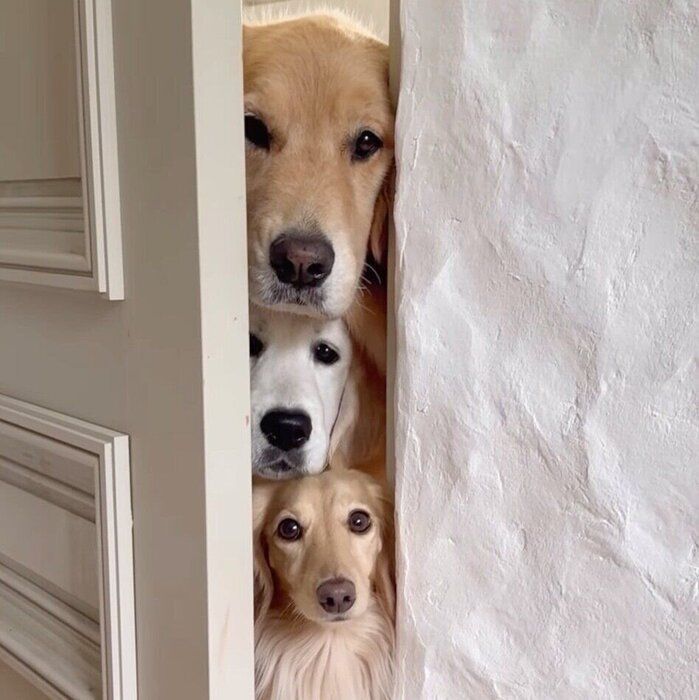 仲良し犬たちの“華麗なコンビネーション”が炸裂!? ドアの隙間で完成した「団子3姉妹」に悶絶