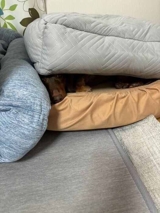 「隠れている場所わかる?」 クッションが大好きな愛犬は、クッションの中に入るのが上手だった!