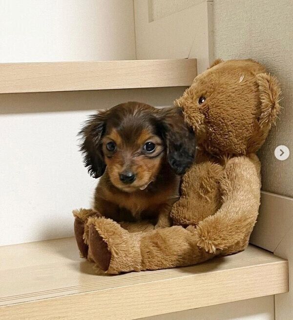 今回紹介するのは、Instagramユーザー@haru_papa1224さんの愛犬ミニチュア・ダックスフンドのハルくん(♂)。こちらの写真はハルくんが生後80日の頃に撮られたものなのですが、ぬいぐるみに見守られながら熟睡している姿が可愛すぎませんか!? 現在2才となったハルくんは、どんな大人のワンコへと成長したのか…ハルくんの成長ビフォー・アフターをご紹介します!