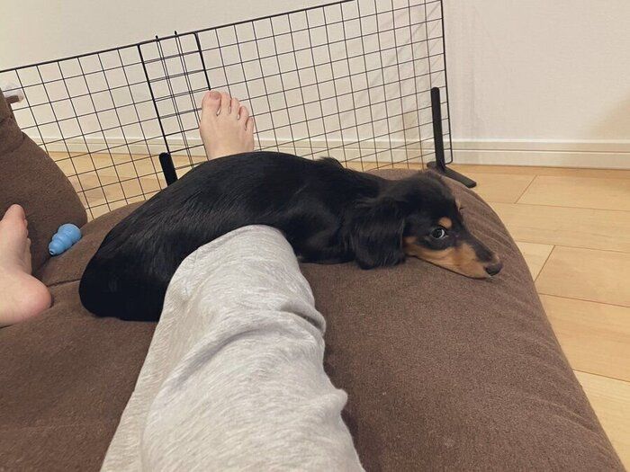 最初は緊張でおとなしかったダックスの保護犬 飼い主の腰にあごを乗せてくつろぐ姿にほっこり
