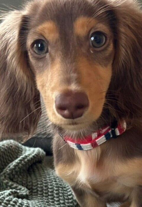 紹介するのは、X(旧Twitter)ユーザー@lat_te0501さんの愛犬・ラテちゃん(取材時1才/ミニチュアダックスフント)。こちらは生後3カ月のラテちゃんの写真です。お迎えして2週間目くらいで、おうちに慣れ始めた頃に撮影されました。