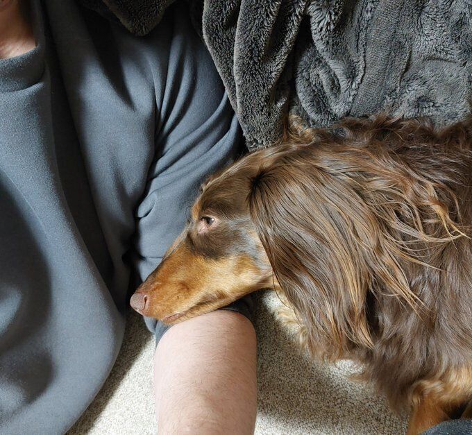 「ふだんはそっけないのに」体調不良のお父さんに寄り添うダックス犬 優しい姿に心が温まる!
