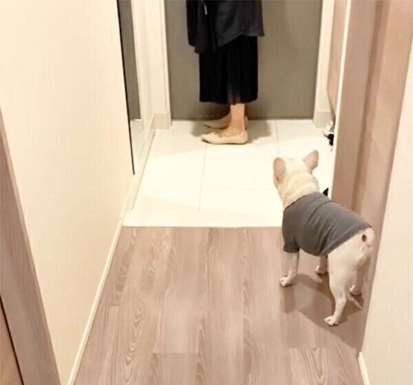 今回紹介するのは、Instagramユーザー@yamawaki.lifeさんの愛犬・やまわきちゃん(撮影時3才/フレンチ・ブルドッグ)。飼い主であるママさんが出かけるときに玄関までお見送りに来ているのですが、ママさんいわく「塩対応」なのだそう。ママさんがナデナデしてくれても冷め気味で対応したやまわきちゃんは、ママさんがドアを開けても近寄る素振りを見せず。もっと寂しがる様子を見せてもいいものですが、やまわきちゃんにはほかに「気になること」があったようなのです。