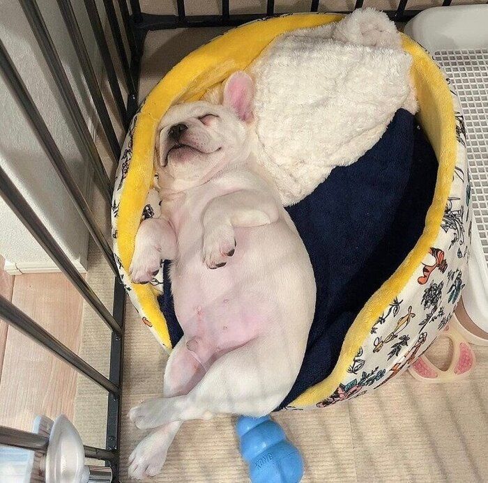 夫婦の間に割り込み、人の枕を使って眠るフレブル あまりにリラックスした姿に「かわいくてくるしい」の声