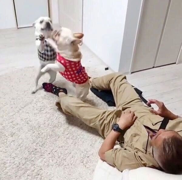 飼い主さんが帰宅したときに、お出迎えをしてくれる犬もいますよね。Instagramユーザーの@bob.0803さんの家でも、パパさんが帰宅したときに、愛犬たちが盛大にお出迎えしてくれるようです!