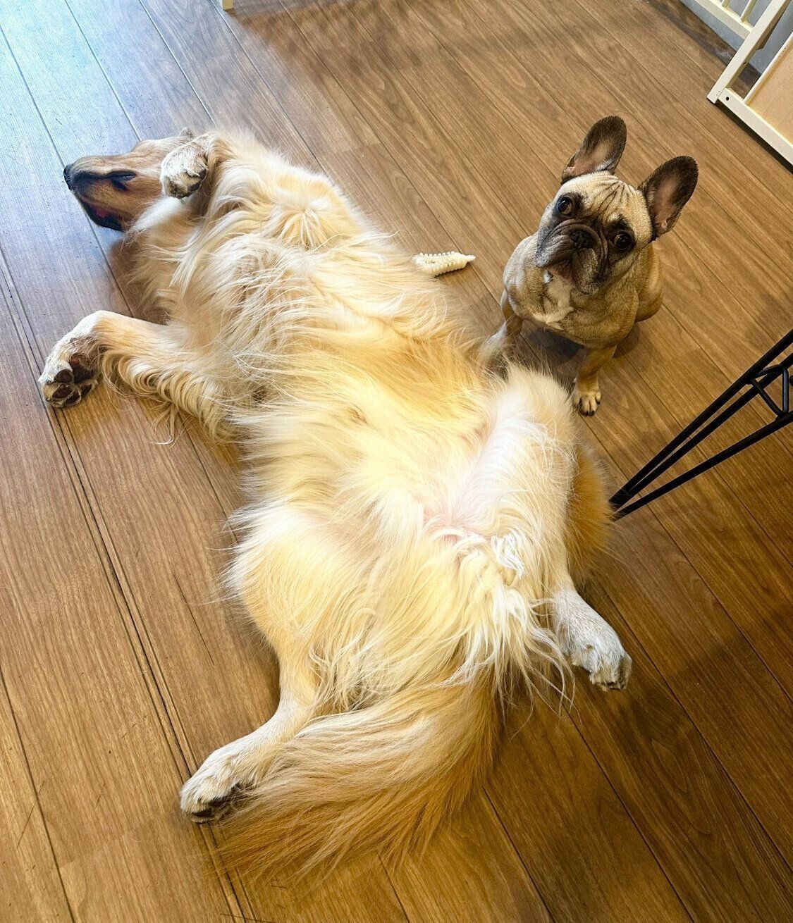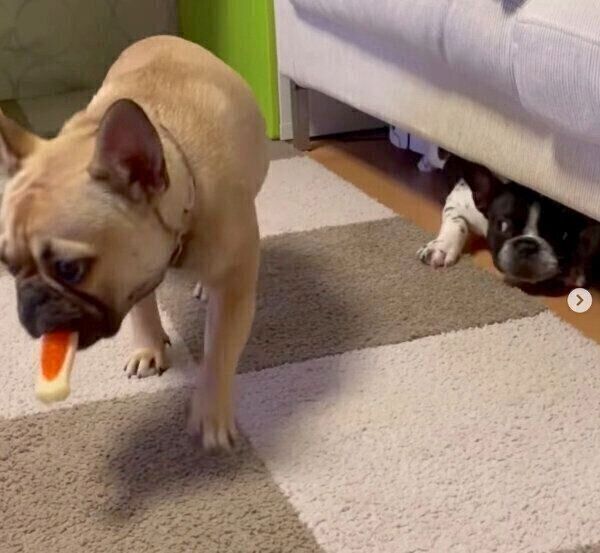 Instagramユーザー@warabi312さんの愛犬・わらびちゃんと、うしたろうくん。フセをしてまったり中のわらびちゃんと、ソファの下に潜っておもちゃをカミカミするうしたろうくん。2頭はそれぞれ自由な時間を楽しんでいるよう♪ しかしこのあと…まさかの展開が待っていたんです!