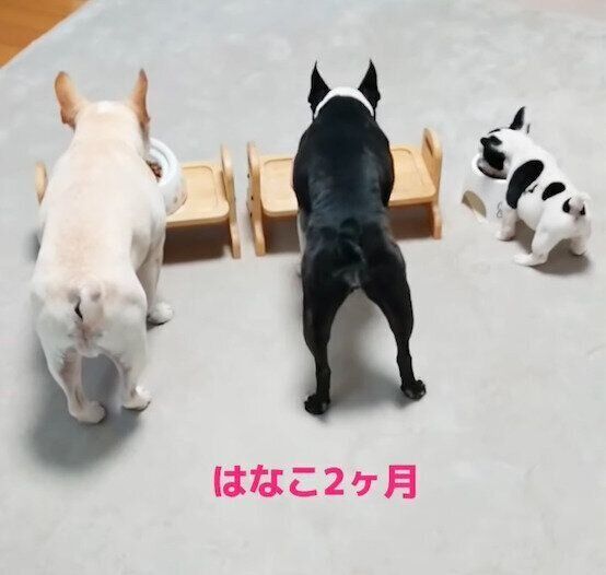 紹介するのは、Instagramユーザー@m_mari89122さんが「ブヒ達の食事シーン」と投稿していた、こちらの動画。そこには、仲良く並んでごはんを食べる3頭の愛犬、はなこちゃん(撮影時、生後2カ月)、ココくん(撮影時9才)、ランちゃん(撮影時6才)の姿が映っています。はなこちゃんをお迎えした頃に撮影した、3頭の食事シーン。なんとも可愛らしい後ろ姿に癒されますが、撮影エピソードもなんとも微笑ましいものでした。