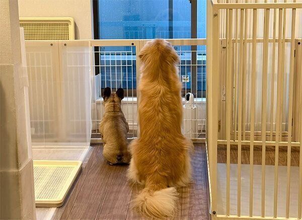 今回紹介するのは、X(旧Twitter)ユーザー@pochimaru324さんの愛犬たちのエピソード。とある雨が降る日の出来事でした。ぽち丸くん(撮影時3才/ゴールデン・レトリーバー)とぷー助くん(撮影時2才/フレンチ・ブルドッグ)が、隣同士で並んで窓の外を眺めていたのだそう。どこか哀愁が漂う後ろ姿にも見えますね。撮影当時について、飼い主さんにお話を聞きました。