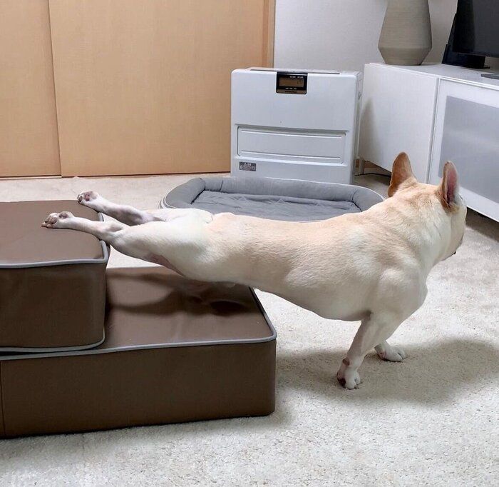 ペットステップでストレッチするのが日課の犬 後ろ足をまっすぐ伸ばして体をほぐす!?