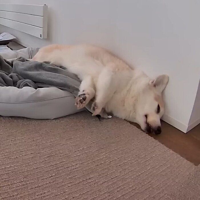 床でぐっすり寝ているのは、Instagramユーザー@jino_corgiさんの愛犬・ジノくん(撮影時4才/ウェルシュ・コーギー・ペンブローク/愛称:ジッさん)。こちらは、とある日のお昼寝中の様子をおさめたものだそう。熟睡っぷりがなんとも愛らしいジノくんですが、この直後、「すごい!」と思わせるような姿を見せていました。