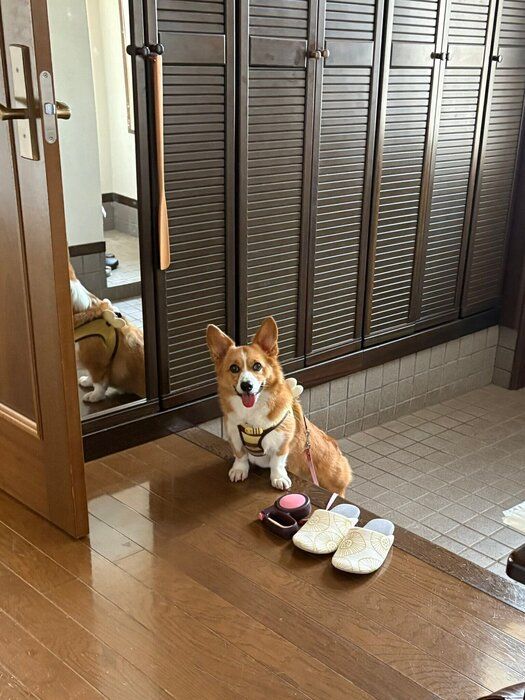 「足を洗うまでは上がらないと守っているつもり!?」玄関に前足だけかけてとびきり笑顔を見せるコーギーが愛らしい!