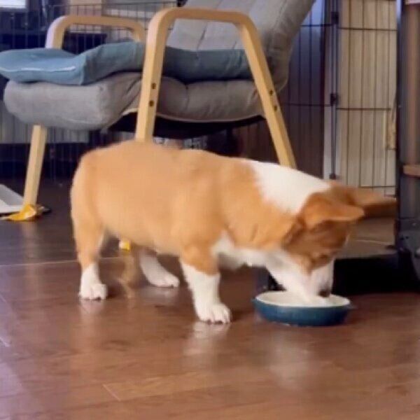きゅうりを切る音が聞こえ、コーギーのモナちゃんがキッチンまでやって来ました。お兄ちゃんにきゅうりをもらうモナちゃん。その後もキッチンの入り口からどかず、少しずつ前進して入り込んでしまいました。キッチンに居座り続けるモナちゃんの動画です。