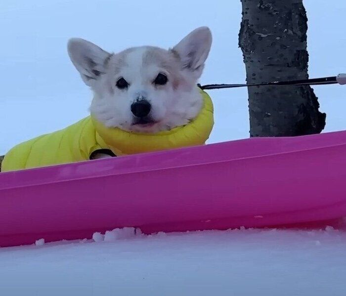 雪の上をソリでのんびりお散歩!シニアになっても自分のペースで楽しむ14才のコーギー