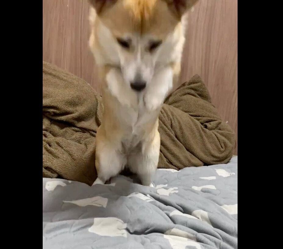 紹介するのは、X(旧Twitter)ユーザー@kopant17さんが「コーギーにダイブされたい人向けの動画」と投稿していた、こちらの動画。そこには、ベッドの上で首をかしげる愛犬・コパンちゃんの姿が映っています。布団を見つめながらフシギそうな表情をしているコパンちゃんですが、なんとこの直後…その場で立ち上がり、飼い主さんのほうに向かって「どーーーん」とダイブ! 思わずクスッとしてしまうコパンちゃんの姿をご覧ください。