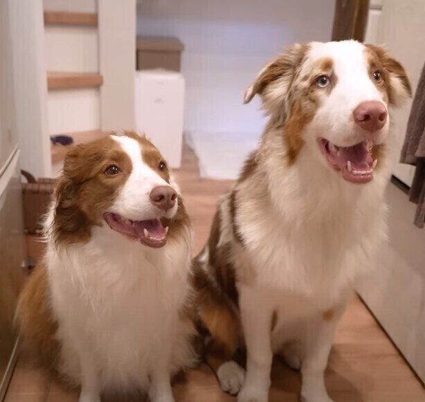 ママとかくれんぼする、ボーダー・コリーのリーリエちゃんとオーストラリアン・シェパードのガルチェロくん。浴槽に隠れたママを上手に見つけました。次は洗濯機の横に隠れたママをいったん通り過ぎた2頭でしたが、その直後にあっさり発見! 動画です。