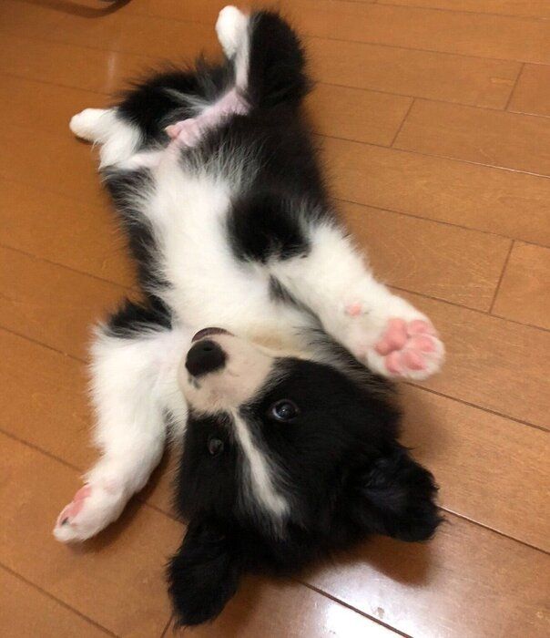 紹介するのは、X(旧Twitter)ユーザー@bordersora326さんが投稿していた、こちらの写真。“ヘソ天”をしながら、両前足を上げて「バンザイ」のポーズをしている愛犬・空(ソラ)くん(撮影時、生後2カ月半/ボーダー・コリー)が写っています。お迎えして3日目に無防備な姿を見せていた空くん。6年後の現在の空くんの様子は……。