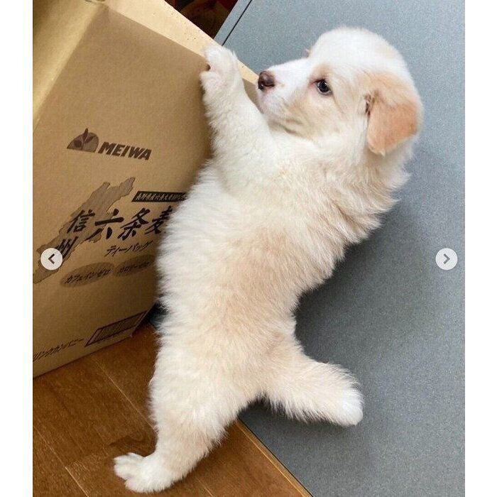 突然、猫のように段ボールに収まってしまったボーダー・コリー→そんな姉犬に困惑するオーストラリアン・シェパード!