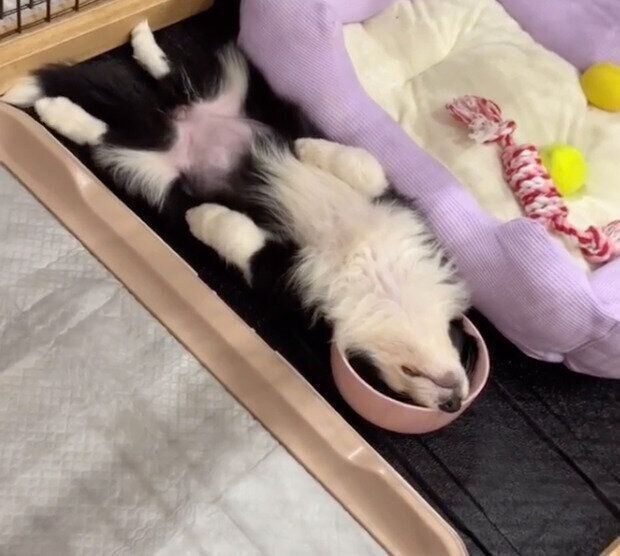 まさかのお皿に頭を突っ込んで熟睡! ご飯中に寝てしまった子犬の寝相にびっくり